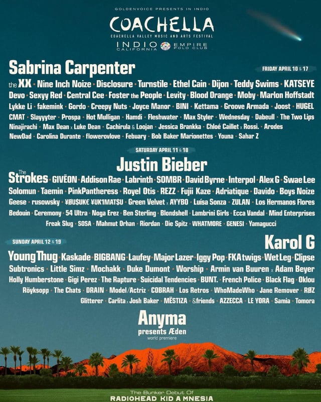 [ad_1] Justin Bieber, Sabrina Carpenter, Karol G and Anyma are slated to headline Coachella 2026, taking place on April 10-12