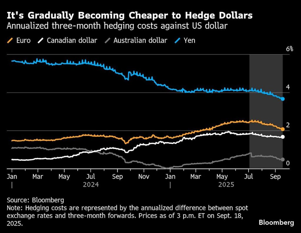 The hedging — which involves using derivatives to bet against the world’s primary reserve currency — helps explain why the dollar is teetering around its weakest level since 2022 even as US stocks have rallied. And now the prospect of more interest-rate cuts from the Federal Reserve is giving a jolt to the phenomenon, by making it cheaper for global investors to mitigate the currency risk that comes with investing in the US.